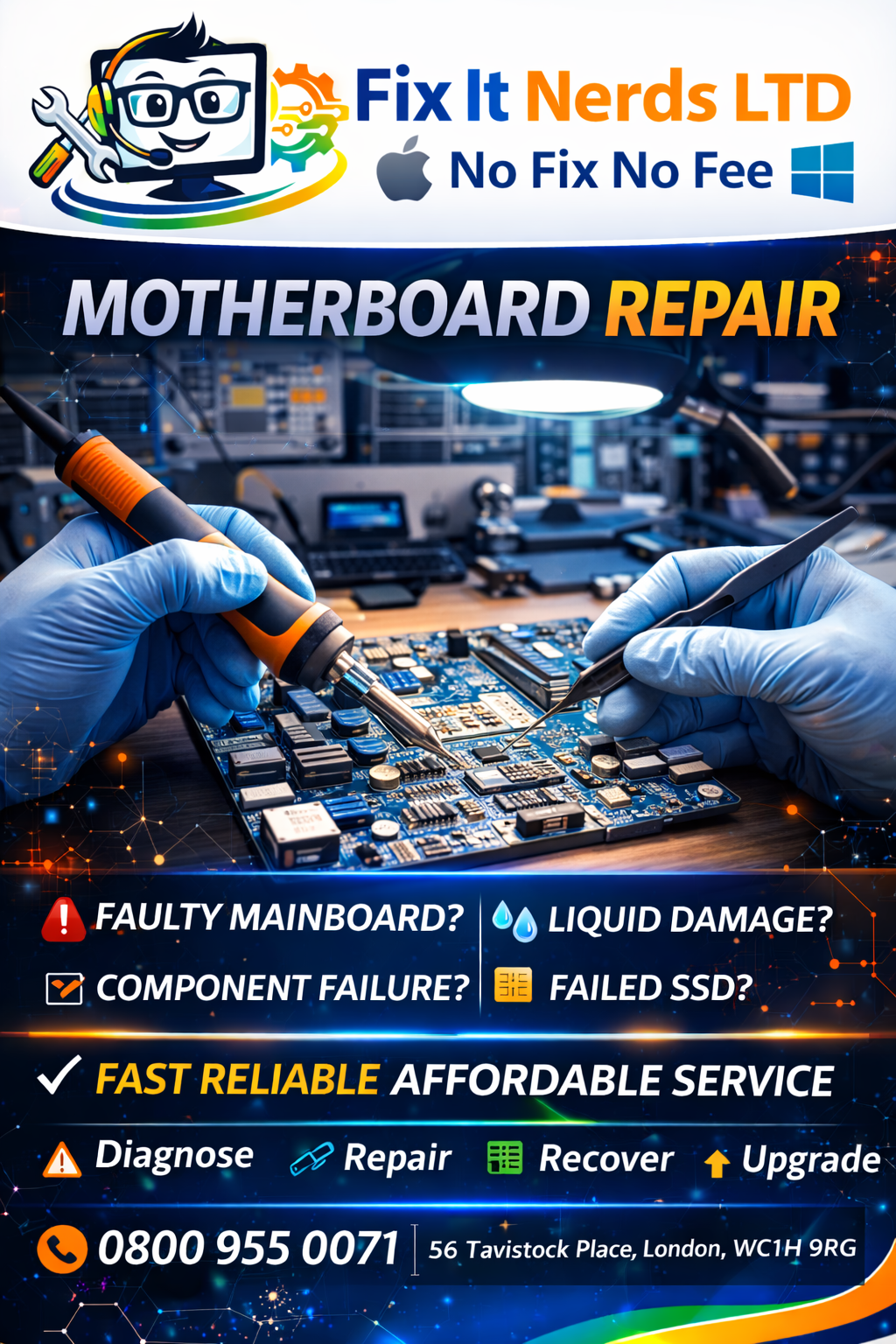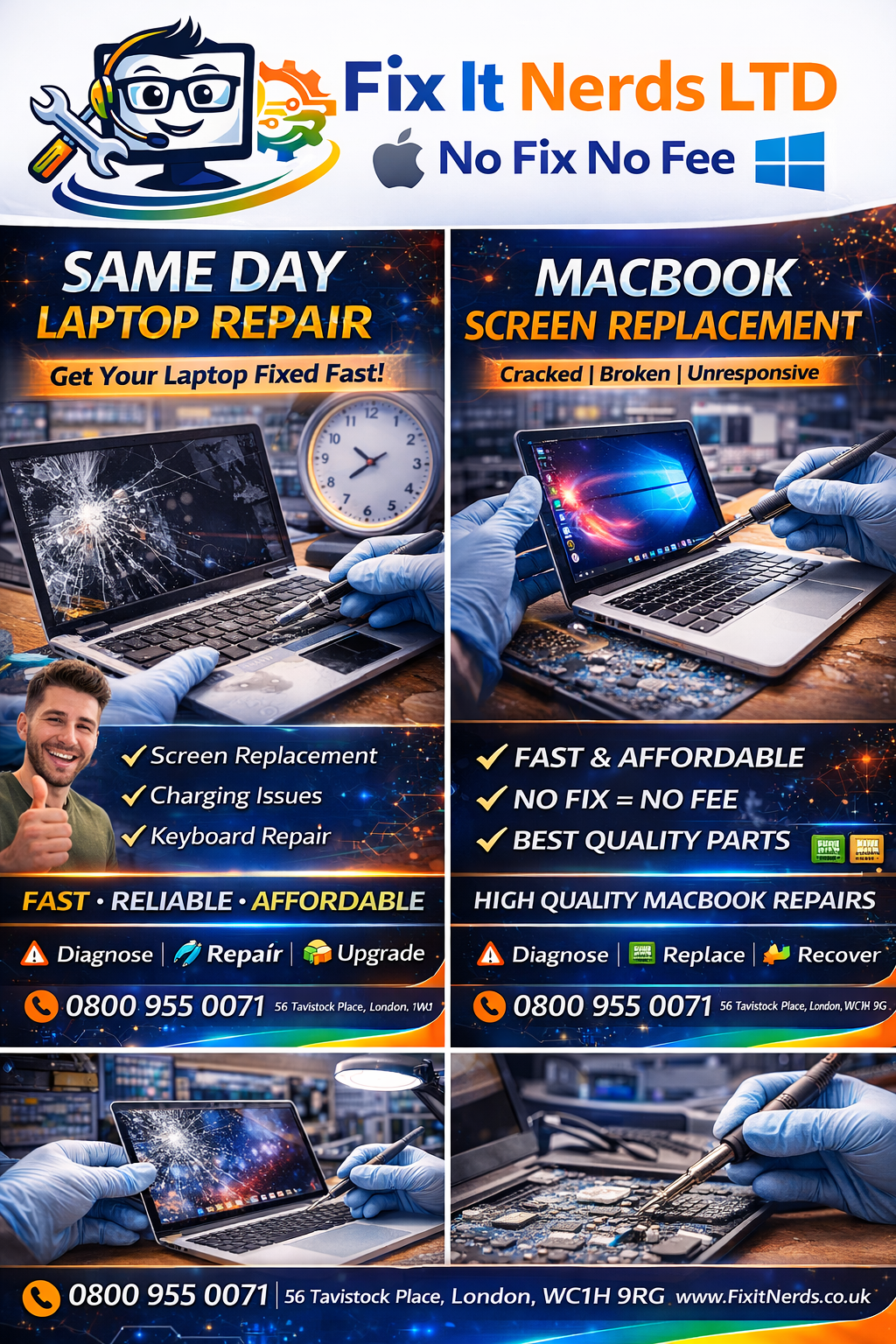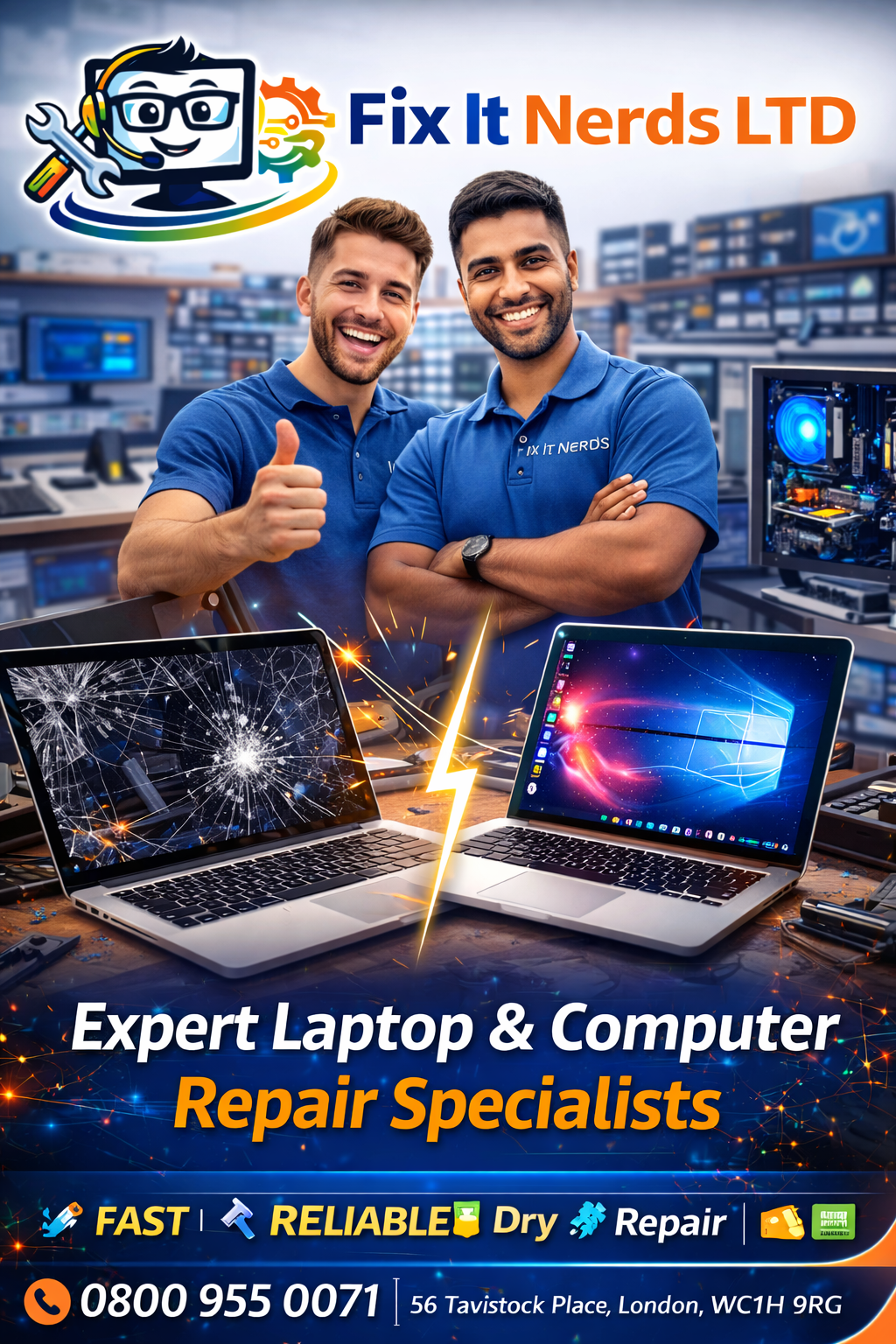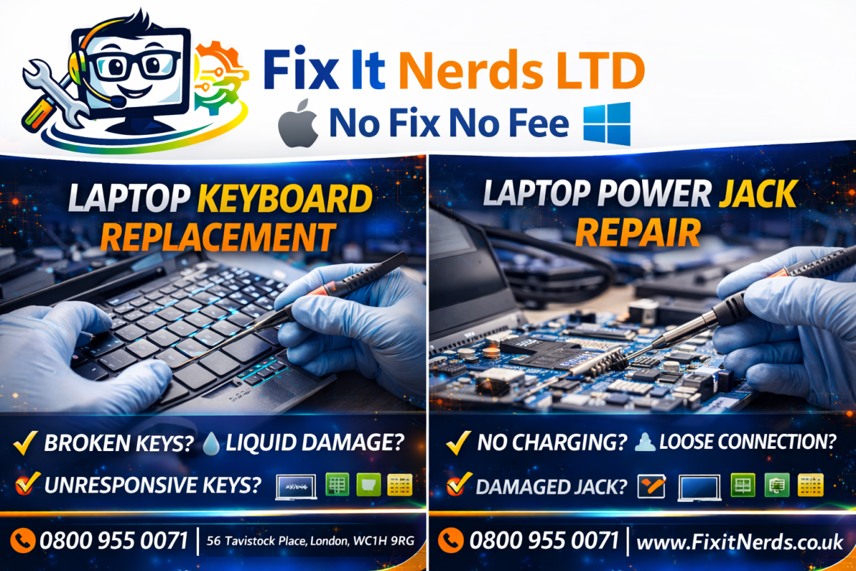 Fix It Nerds is a leading laptop and computer repair specialist based in London, providing fast, reliable, and professional repair services for both individuals and businesses. With years of hands-on experience, our expert technicians are skilled in diagnosing and repairing all types of hardware and software issues across a wide range of devices, including Apple MacBooks, Windows laptops, desktop PCs, and custom-built systems.