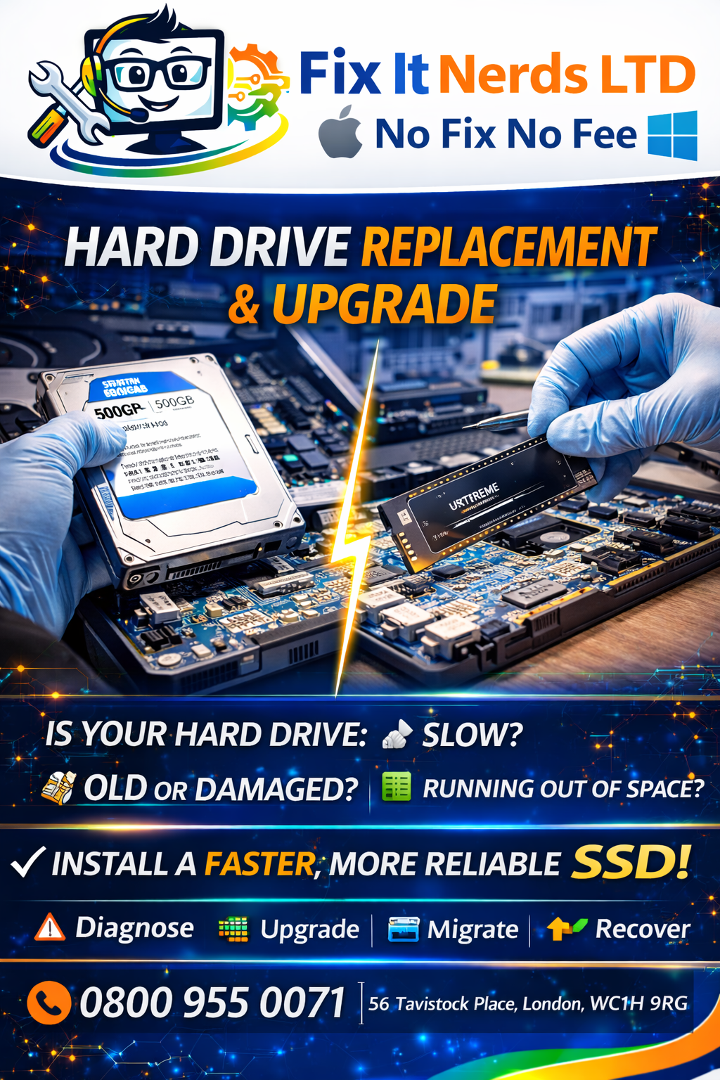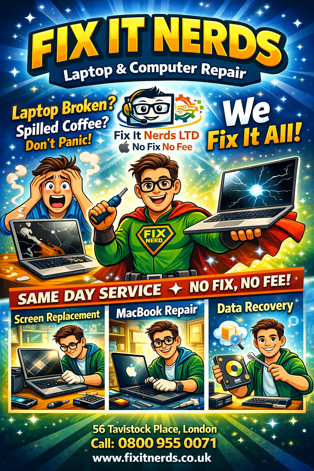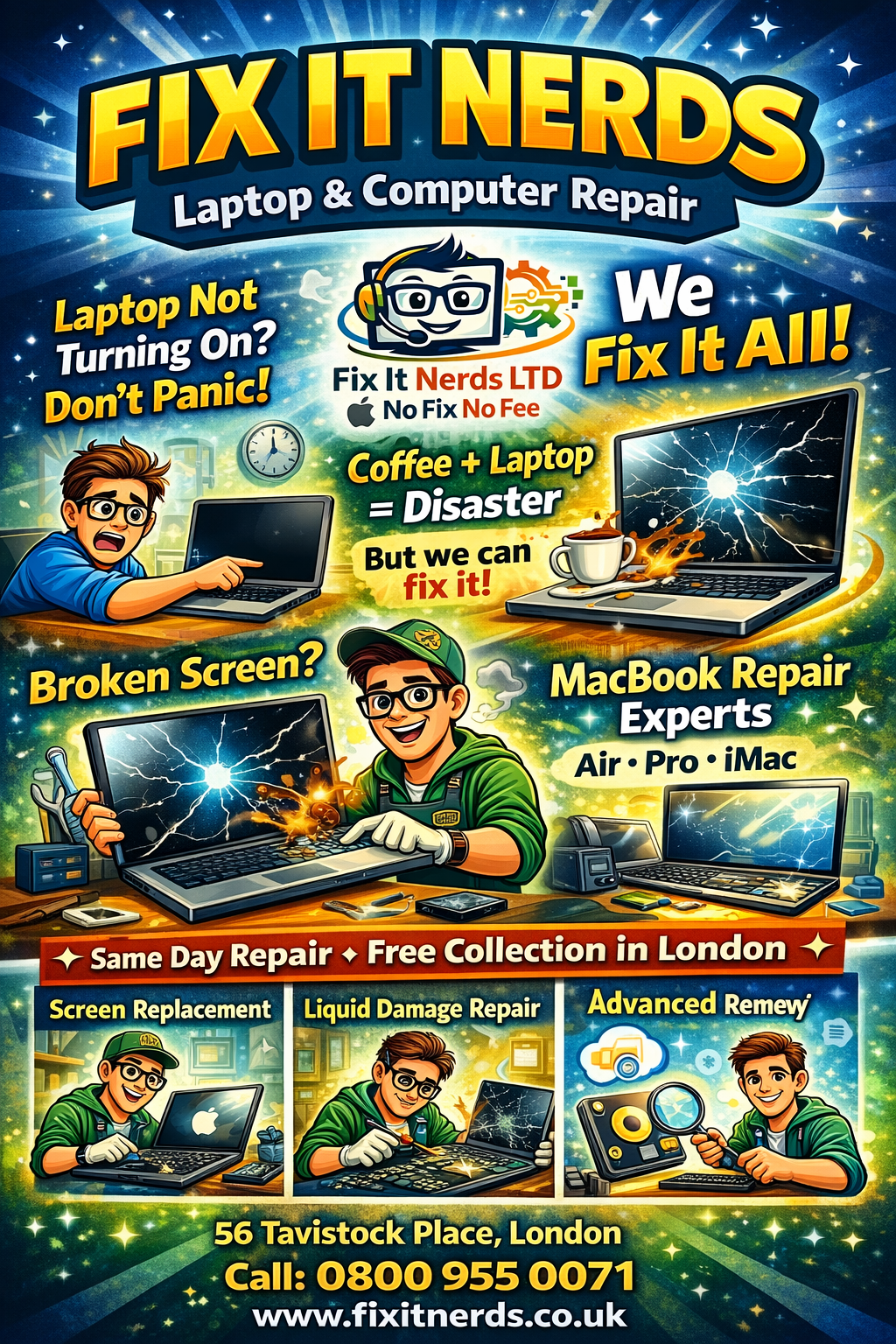 Fix It Nerds is a leading laptop and computer repair specialist based in London, providing fast, reliable, and professional repair services for both individuals and businesses. With years of hands-on experience, our expert technicians are skilled in diagnosing and repairing all types of hardware and software issues across a wide range of devices, including Apple MacBooks, Windows laptops, desktop PCs, and custom-built systems.