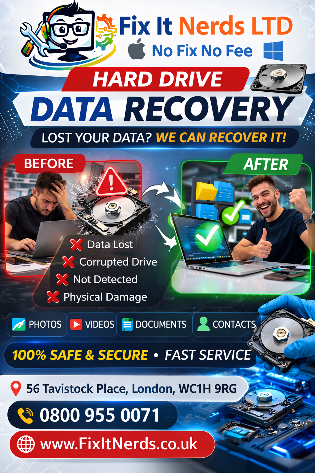 At Fix It Nerds, we operate with a strict “no fix, no fee” policy, giving customers peace of mind that they only pay when their device is successfully repaired. We pride ourselves on transparent pricing, honest advice, and exceptional customer service, making us one of the most trusted computer repair specialists in London.